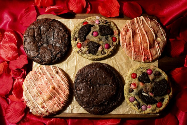 The Lover’s Half Dozen includes two full-size cookies of each of our limited-edition Valentine’s Day flavors, double the love, double the indulgence. This box features Brownie Bliss, Strawberry Kiss Cheesecake Cookie, and Cupid’s Crush (our Valentine’s Day M&M cookie).